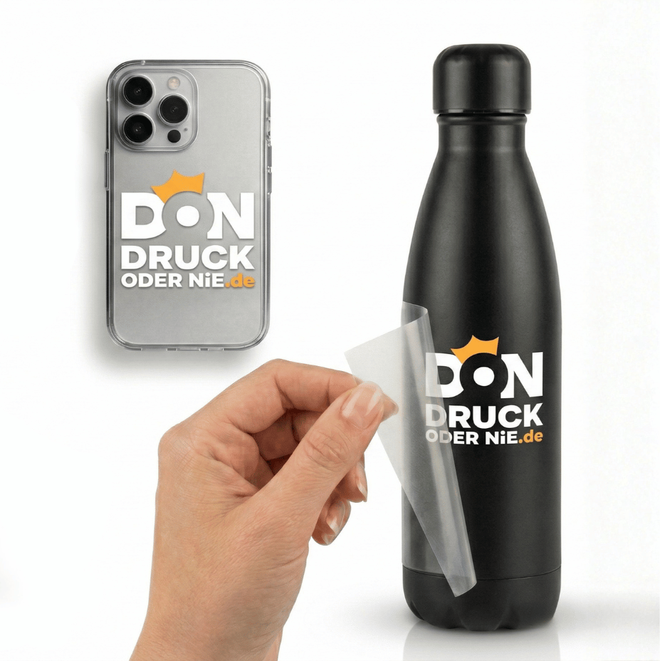 Motiv hochladen, Bügeltransfer-Typ wählen (Baumwolle oder Polyester), optional Textilien dazubestellen — fertig. Keine Mindestmenge, keine versteckten Kosten. Lieferung in 2–4 Tagen direkt zu euch.